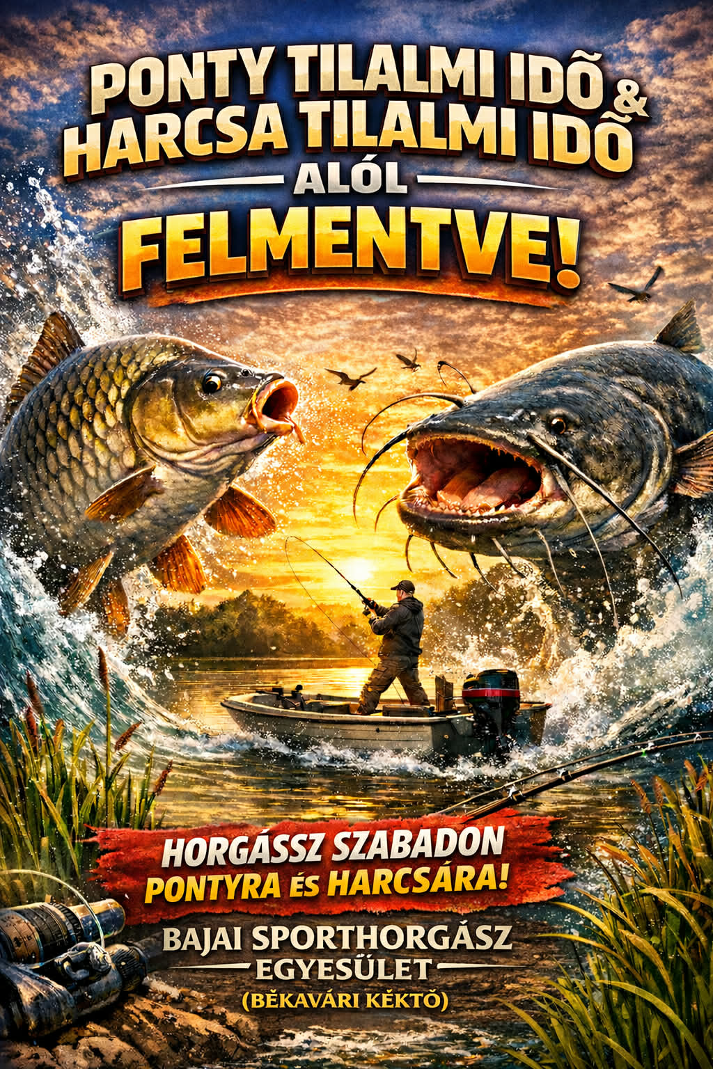 Bajai Sporthorgász Egyesület, mint feltüntetett kezelésében álló halgazdálkodási vízterület jogosultját, az alábbi halfaj vonatkozásában fajlagos tilalmi idő betartása alól, a jogszabályban előírt méret és darabszám korlátozás betartása mellett harcsa halfaj vonatkozásában 2024. 05. 02. – 2024. 06. 15. időszakban felmentést kapott.